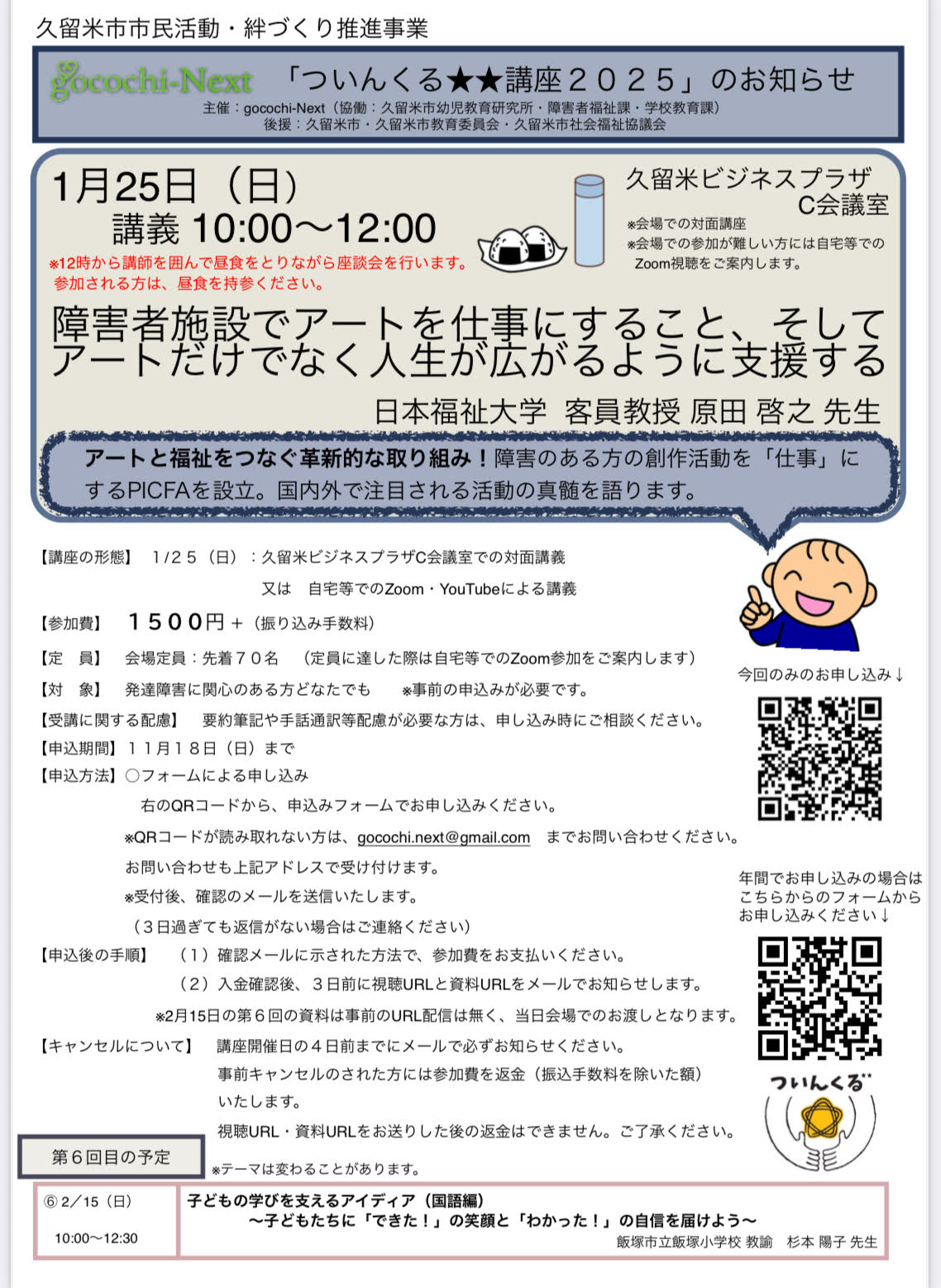 ついんくる★★講座2025 第5回 お申し込みはこちら 2025.11.16 Tweet シェア ついんくる★★講座 第5回 講師:障害者福祉サービス事業所PICFA施設長 日本福祉大学 客員教授 原田 啓之先生 テーマ:障害者施設でアートを仕事にすること、そしてアートだけでなく人生が広がるように支援する お申し込みはこちら 年間でのお申し込みはこちら Tweet シェア